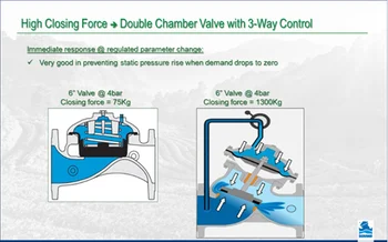 En caso de condiciones de baja presión en la red, una válvula de doble cámara con piloto de tres vías puede ventilar completamente la cámara de control, permitiendo que la válvula se abra por completo. Esto significa que la válvula es transparente en cuanto a la pérdida de carga. Además, la resistencia de la válvula se vuelve mínima y la válvula suministra suficiente presión a los consumidores sin generar una caída de presión omisible.