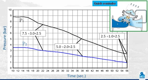 Cuando la válvula está casi cerrada y la pérdida de carga comienza a acumularse, la presión aguas abajo empieza a disminuir. El equilibrio de fuerzas sobre el disco de cierre cambia y la presión aguas arriba hace que el proceso de cierre se ralentice. Como resultado, el final del proceso de cierre es suave y delicado. Esta función incorporada es esencial en los sistemas modernos de suministro y distribución de agua, ya que los protege contra escenarios potencialmente dañinos, como el golpe de ariete debido al cierre de la válvula.