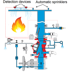 NFPA 13 «Permite la entrada de agua a la tubería de rociadores al activarse tanto los dispositivos de detección como los rociadores automáticos»