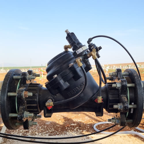 To address pressure fluctuations and minimize hydraulic pressure spikes when valves open or close, BERMAD selected composite double-chamber valves from the 100-DC series, a hydraulically operated, diaphragm-actuated control valve made with robust composite materials, often used in drip and micro systems.