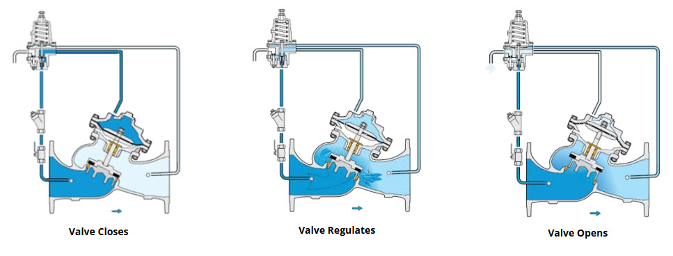 Cuando la presión aguas abajo es menor que el punto de ajuste requerido, el piloto drena el agua de la cámara de control a la atmósfera y la válvula se abre.