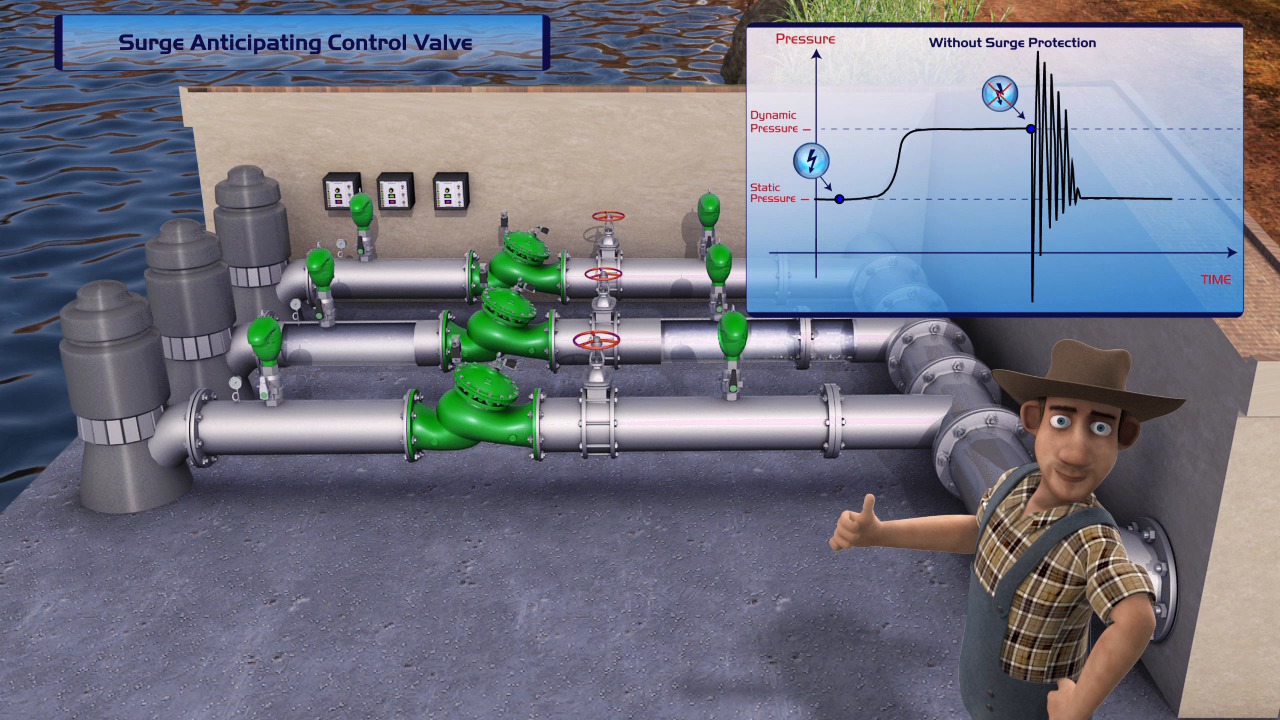 Le coup de bélier causé par une coupure de courant peut poser problème même dans les systèmes à basse pression. En effet, l’augmentation de pression dépend de la longueur de la conduite et de la vitesse de l’eau, et non de la pression de fonctionnement initiale. Ce sont la vitesse de l’onde et le rapport entre la pression de conception et la pression de pointe due au coup de bélier qui provoquent les dommages.