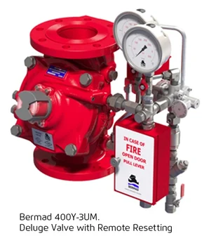 Standard deluge valves require a local manual resetting option where an operator must be physically present at the valve location to reset the valve. Actuation – whether hydraulic, electric, pneumatic, or a combination such as electro-pneumatic or electro-hydraulic – is remote and may take place manually or automatically. In valves of this type, for example the BERMAD model 400Y-3UM, local manual reset is compulsory. This type of valve meets the specifications of FM- and CE-marked products, as well as UL-listed valves.