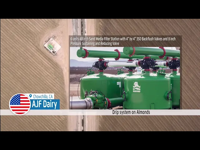 Sand media filter station with backflush valves and pressure sustaining and reducing valves.