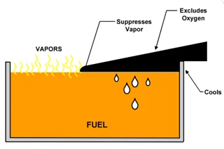 Foam is typically the fire suppression agent of choice in situations where combustible or flammable liquid is stored in tanks or bulk storage facilities. It is especially effective when the flammable liquid has a surface where the foam can be applied. Unlike water, which is heavier than most flammable liquids and will sink ineffectively to the bottom, fire suppressing foam is lighter and will rise to the top. There, it creates a blanket on the surface, reducing vapor formation, preventing oxygen from reaching the combustible liquid and effectively smothering the potential fire.