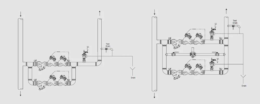 In this system, each branch is equipped with independent 720 pressure reducing valve, backed with a “watchdog” 720-PD-X valve. Each branch can work independently, by isolating the other branches in the system. A single 43Q Quick Pressure Relief Valve provides pressure spike relief for both branches and can be maintained without shutting off water supply.