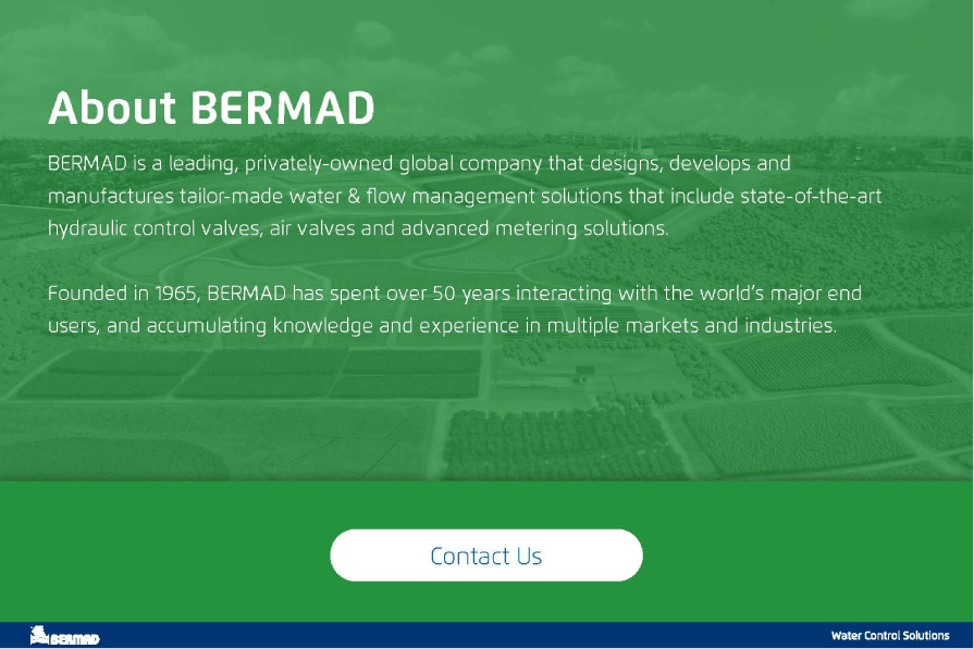 If you are a farmer or grower anywhere in the world, you probably recognize BERMAD as a trusted name in irrigation. You may already know that BERMAD has been manufacturing proven hydraulic control valves, air valves, and water meters for irrigation systems since 1965, including innovative products for both field and greenhouse applications. And you may even have received irrigation system design assistance from our engineering team, or taken advantage of one of our instructional videos.