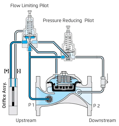 BERMAD’s Flow Control & Pressure Reducing Valves, such as models IR-472-U, IR-172-d and IR-972-V, are equipped with two different pilots, where one pilot is performing the Flow Limiting function and the second pilot is performing the Pressure Reducing function.