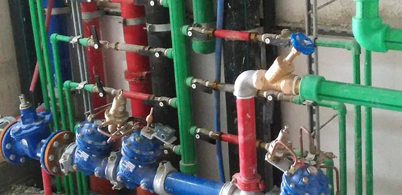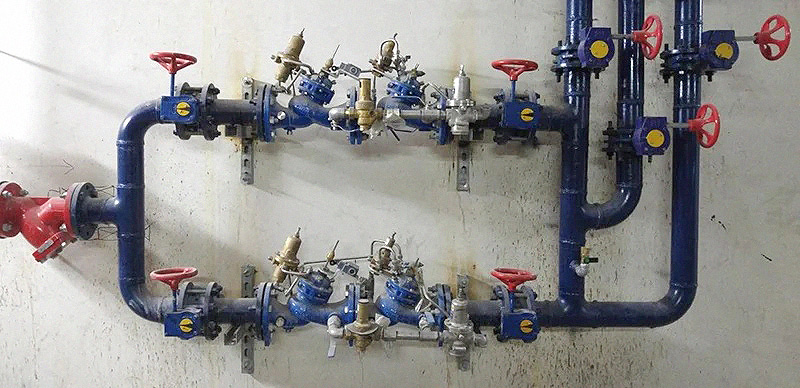 A double branched installation featuring the BC-72S-B2H-P backed-up pressure reducing system with off peak flows bypass and integrated relief device, provides a 24/7 pressurized water supply with maximal safety and compact design.